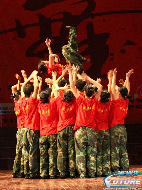 取灵感于今年5.12汶川大地震,90后的数院学子用柔弱的双臂,双肩演绎了地震中不畏艰险,不惧死亡的救援人员的感人故事。衣裳破了,脸颊脏了,如痴如狂,演员们用真诚撼动现场,发自内心的“呼——哈——”呼喊声,将观众带回了那段特殊的日子,给观众重现了当时的感人一幕又一幕。最终,天美传媒