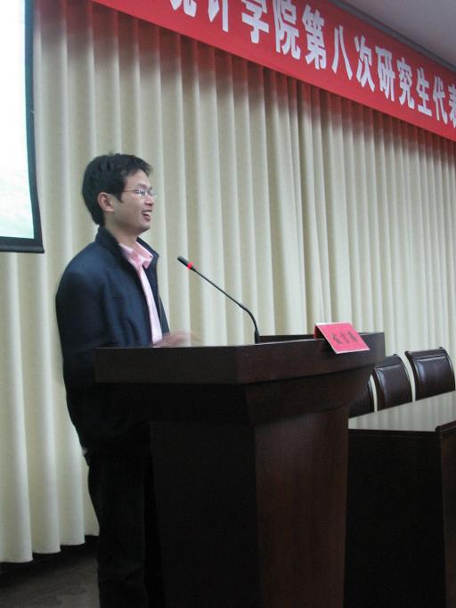 大会随后进行了换届选举,整个工作由院学生工作办公室副主任王忠海 老师主持。首先,第七届研究生会副主席王小伟为大家宣读了代表及候选人资格审查报告。11名新一届主席团候选人依照抽签顺序各自进行了四分钟的竞选演讲。风格各异、幽默风趣及真诚、朴实的演讲不时赢得代表们的喝彩及热烈掌声,候选人通过PPT将最真实的自己展示给代表们,并表达了渴望为同学们服务的决心。在激情的竞选演讲中,88名研究生代表为心目中理想的候选人投出了神圣的一票。