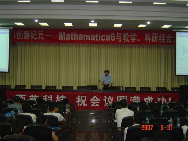 数学会堂及数学建模基地举行。6月31日下午,美国Wolfram研究公司的战略暨国际发展执行总裁Conrad Wolfram先生作了《再创Mathematica科技计算新纪元》的报告,Wolfram研究公司的高级软件工程师胡一凡博士作了《Mathematica及其在科技领域中的应用》的报告,中国科技大学张韵华副教授作了《Mathematica在教学改革中的作用》的报告。6月1日上午,胡一凡博士对Mathematica 6.0作了介绍和培训。会议由天美传媒