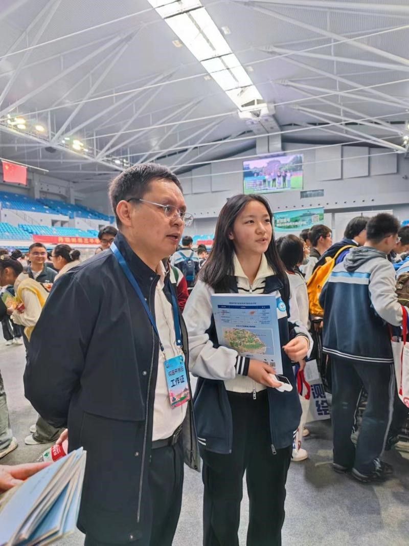 在卓尔体育馆主会场,院党委副书记刘珊珊、副院长王茂发、副院长王六权、信息与计算科学系李订芳等多名教师和学生志愿者在我院展位前为高中生答疑解惑,发放宣传资料。针对高中生和家长提出的招生政策、专业设置及培养模式等问题,逐一热情回答�学生志愿者设计的数学小游戏,吸引众多高中生前来参与,体验数学的魅力�