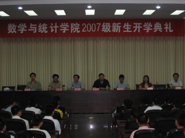 2007级本科生新生开学典礼于9月10日上午在数学会堂隆重举行。参加开学典礼的院领导有党委书记尹常倬教授、院长陈化教授、党委副书记吴蜀江老师、副院长羿旭明教授。开学典礼由院学生工作办公室主任黄安云主持。各系系主任及学工办老师参加。