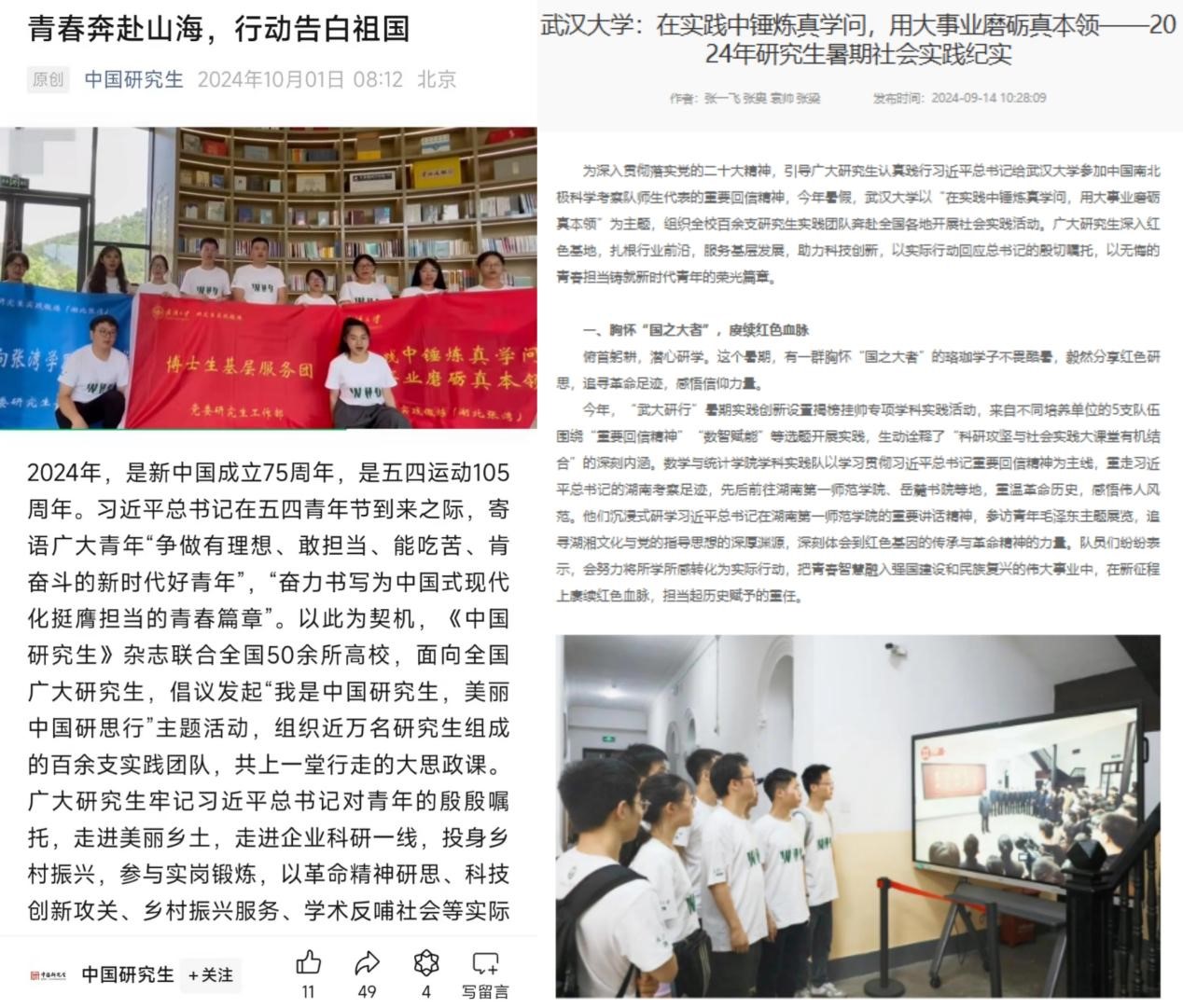 培育先进典型,注重宣传报道�学院实践育人成果丰硕,涌现了先进团队和优秀个人,相关事迹得到多家国家级、省级、校园媒体报道。学�2024年“武大研行”揭榜挂帅专项暑期学科实践团队(全校�5支)的事迹得到全国高校思想政治工作网报道�2023级硕士生黄李英在在社会实践中参与制作的视频被国家级媒体“中国研究生”公众号采纳。“学习习近平总书记重要回信精神寒假实践队”在武汉大学寒期社会实践优秀团队评比中获得一等奖,事迹被《新湖南》(湖南日报新媒体)和《武汉大学学习习近平总书记重要回信精神专题网站》报道。学院研究生骨干党纪学习教育实践活动被《武汉大学党纪学习教育专题网站》首页报道。这些新闻报道产生了良好的社会影响,为研究生树立了良好的榜样,激励着广大研究生投身社会实践的大熔炉,在丈量祖国大地的过程中锤炼真本领�