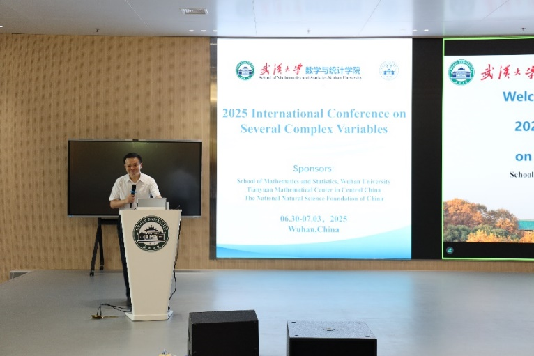 党委书记李勤致辞,他指出本次会议汇聚了全球顶尖数学学者,期待通过深入研讨推动理论数学与应用数学的融合。