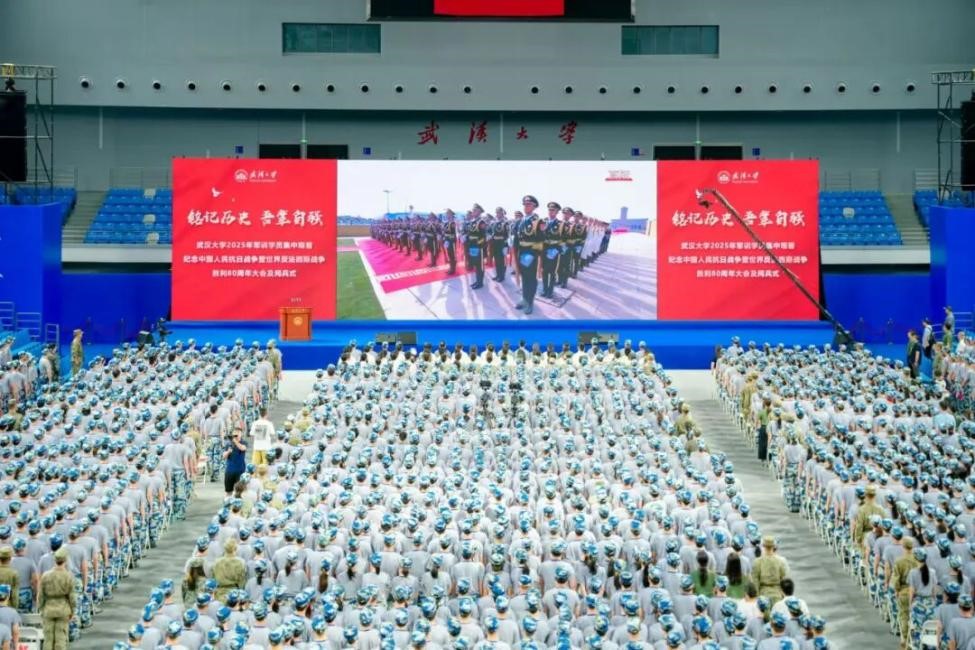 红色教育贯穿军训全程。9月3日,全校新生共观纪念中国人民抗日战争暨世界反法西斯战争胜利80周年大会及阅兵式,学子们深刻体会到国家强盛与和平生活的珍贵。同日下午,军训二团动员大会在桂园操场召开,在珞珈山下吹响军训冲锋号,为训练注入强劲动力。9月9日晚,在军训二团纪念抗日战争胜利主题演讲比赛中,天美传媒