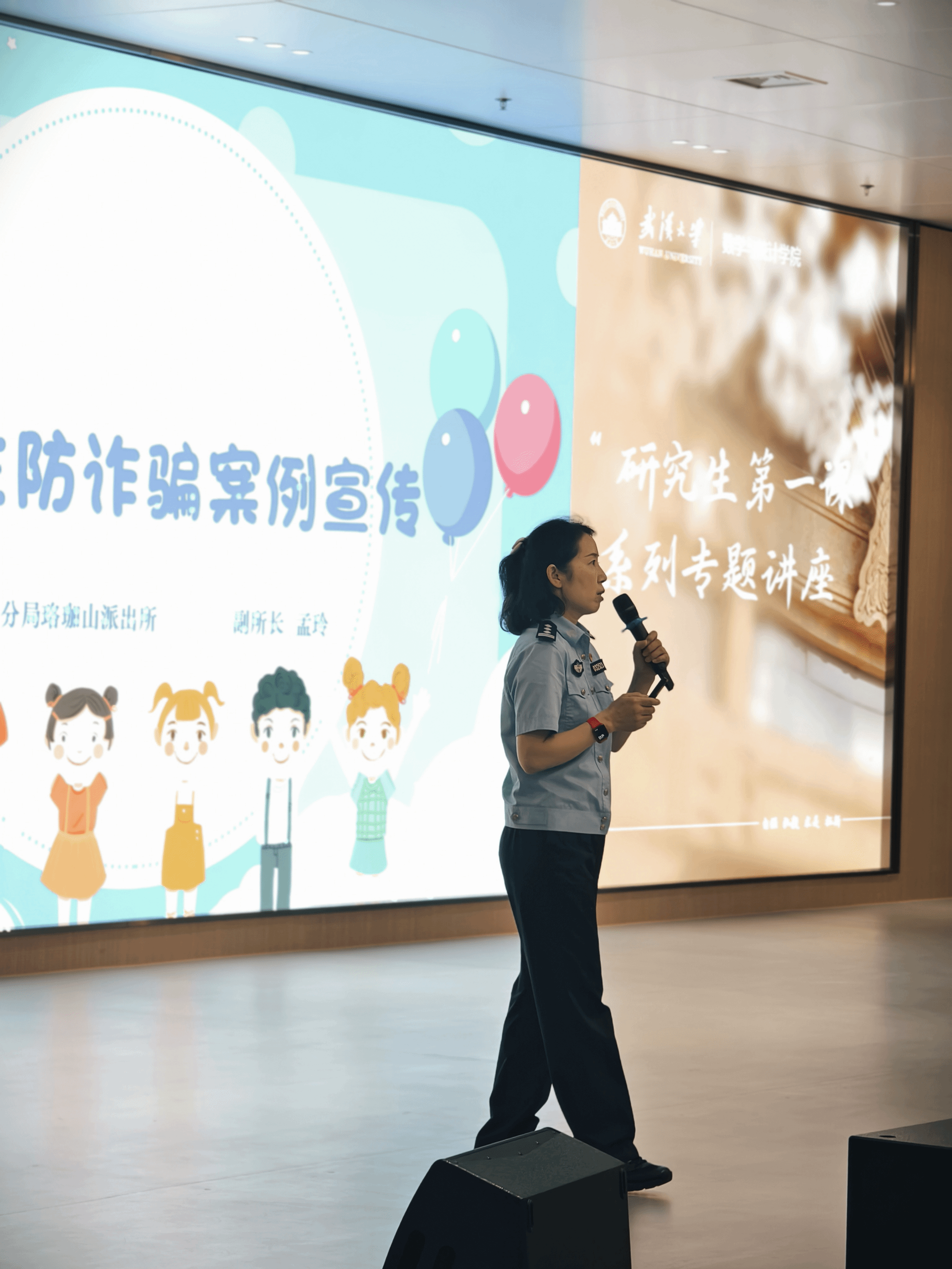 本次新生教育特邀珞珈山派出所孟玲警官和学校心理健康教育中心郭旭东老师开展防诈骗宣传和心理适应教育,增强新生的安全意识和自我调适能力。