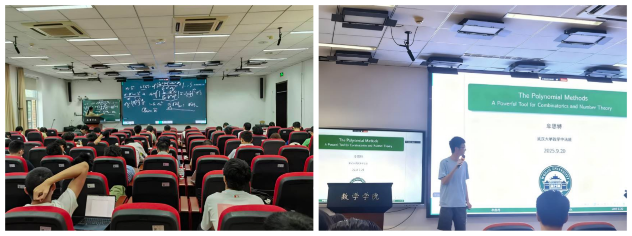 中法数学拔尖班牟思特同学以《The Polynomial Methods: A Powerful Tool for Combinatorics and Number Theory》为题作学术报告,系统阐释了基础线性代数在组合数学与数论研究中的桥梁作用,展现出扎实的专业基础与逻辑思辨能力。自由交流阶段,同学们围绕学术前沿、学习方法、学科交叉等议题展开热烈讨论,在思维碰撞中拓宽视野、增进理解。
