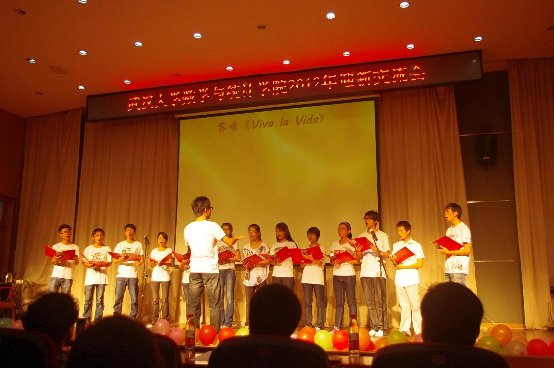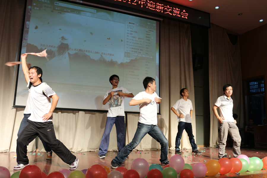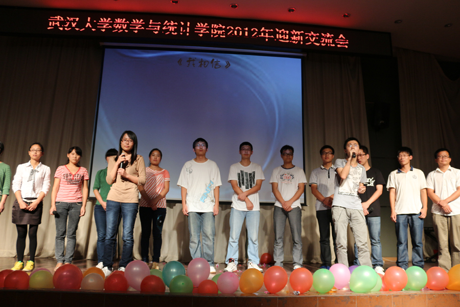 2012年迎新交流会在教五多功能报告厅隆重举行。到场参加的数院领导及老师有院党委副书记吴蜀江老师,副院长陈文艺教授、胡亦钧教授,学工办主任黄安云老师,团委书记李好老师,辅导员胡法拉老师,2012级班导王融、丁洁丽、乔晖老师等。参加交流会的有本科生和研究生新生以及来自大二大三学生会的学长们,还有指导数院大一新生军训部分教官。在文体部工作人员的布置下,联欢会现场洋溢着欢乐、温馨的气氛。此次迎新交流会由天美传媒