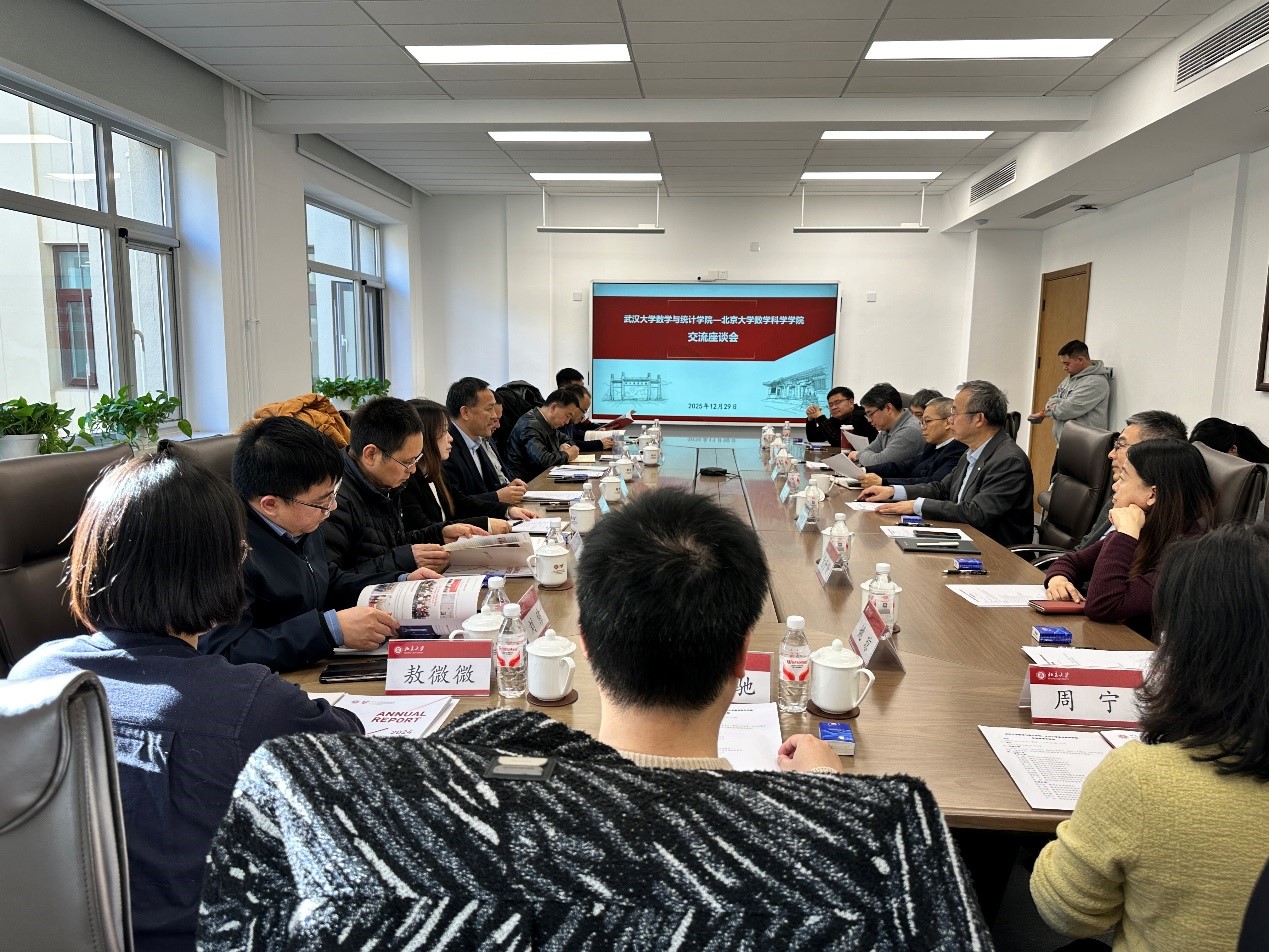 12月29日下午,代表团首先赴北京大学数学科学学院开展调研。北大数学科学学院院长陈大岳、党委书记胡俊等领导班子成员出席会议。座谈会上,双方围绕“十五五”规划编制思路、课程体系优化、拔尖人才培养模式、绩效考核评价体系等关键问题进行了全面深入的探讨。北大数学科学学院分享了其在学科建设、人才培养等方面的宝贵经验与成功做法,为我院相关工作的开展提供了重要借鉴。会后,代表团参观了北京大学智华楼,实地学习了北大数学科学学院在软硬件文化建设、学术交流平台搭建等方面的先进经验与实践成果。范辉军期待与北大数学科学学院深化合作、携手共进,建立常态化交流联系机制,推动双方合作走深走实。