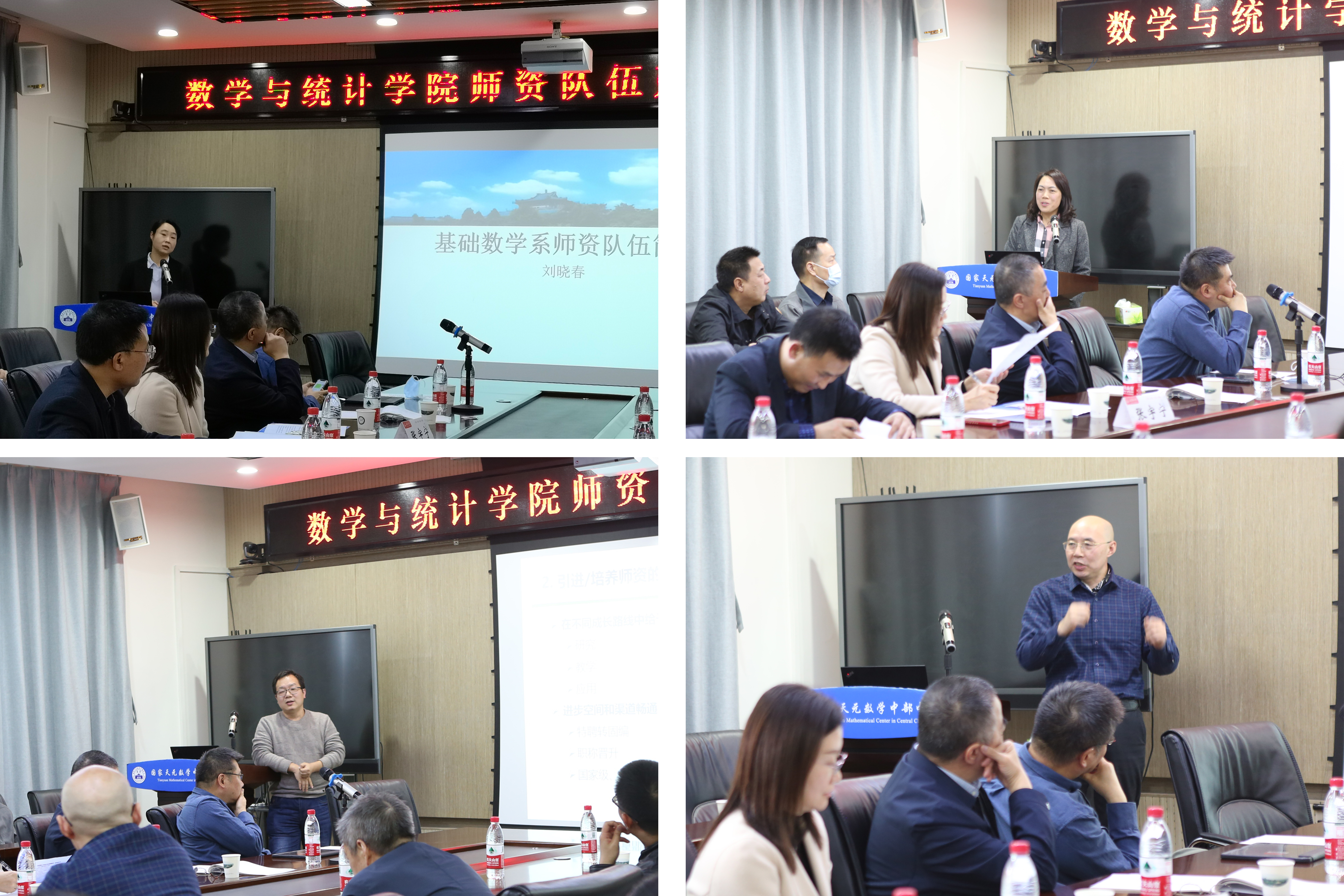 基础数学系主任刘晓春、应用数学系主任吴晓群、信息与计算科学系主任吕锡亮、概率与统计科学系主任让光林分别介绍了本系师资队伍结构和建设现状,分析了存在的不足和面临的问题,就如何做好引进和培育工作提出了思路。