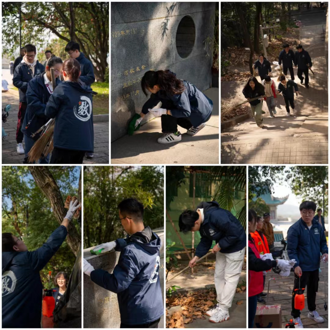 樱顶老图书馆门前,伴随着晨曦与鸟鸣,师生分为五组清扫了樱园各个片区地面与草坪上的落叶及树枝、擦拭了王世杰、王星拱、闻一多、李国平等大师先辈雕像上的灰尘并清理了周边的杂草�
