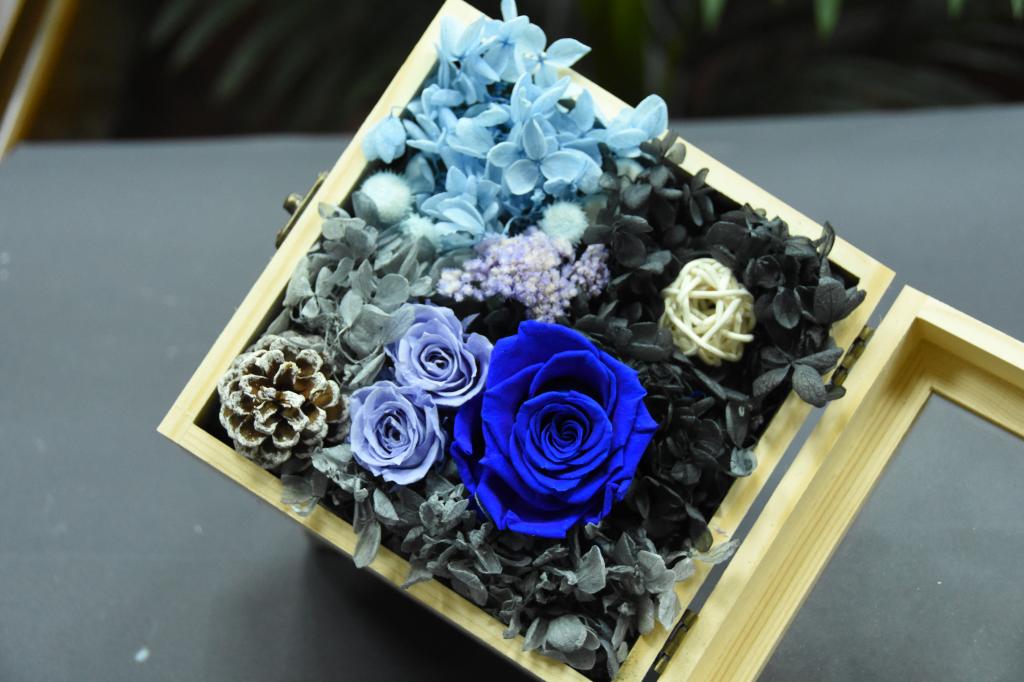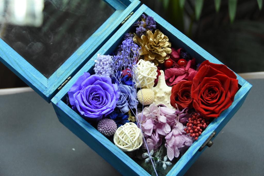 所有准备工作已经就绪,好戏正式开场!在方老师的带领之下,同学们首先将工作台上面准备好的花泥切割成合适的大小放入自己挑选的花盒之中,并用胶枪将花泥粘贴固定,至此,完美的底座便完成啦。接着,方老师示范了玫瑰花的两种制固定方法,以及如何固定花盒中的标配——绣球花。在同学们制作永生花盒的过程中,方老师一直在提供帮助,不仅随时解答他们的疑问,而且不断地提醒同学们要小心操作不要受伤。经过三个半小时的努力,每个人都制作出了自己专属的永生花盒!