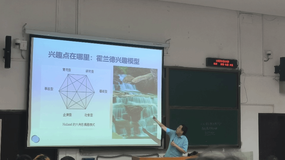 随后,赵健老师深入讲解了影响职业选择的三个重要因素:童年经历、兴趣类型和生活压力。他指出,童年的理想或阴影会引导一个人选择或规避某些职业,而在霍兰德的六角形兴趣模型中,各个人格维度的矛盾或辅助关系可以帮助同学们更好地判断自己的职业倾向。同时,现实的生活压力也是职业规划过程中必须考虑的因素。