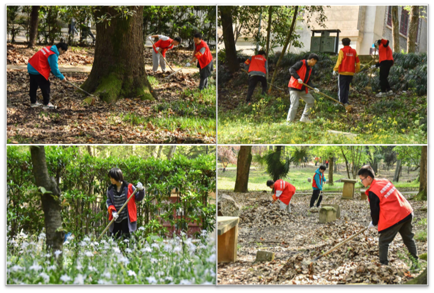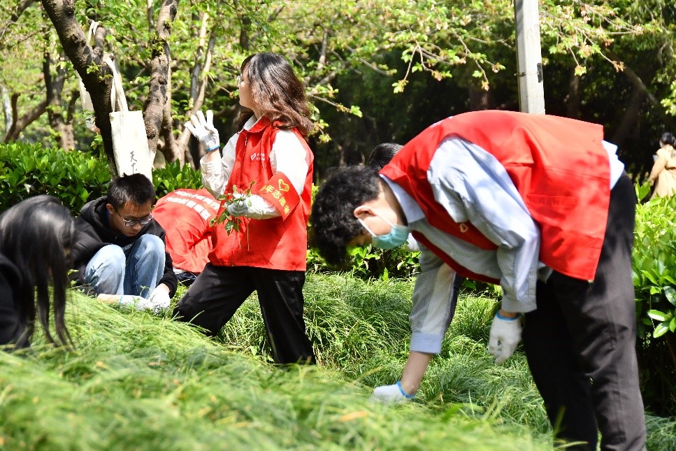 武汉的四月,温度迷人,草丛中是一道道鲜红的身影,一双双手清理着那难缠的杂草。志愿者们辛勤劳作,让樱花大道美观而大方。在清扫落叶的过程中,志愿者们切身感受园林工作者的辛苦,看着逐渐整洁的山坡小路,志愿者们体会着团结和奉献的重要性。
