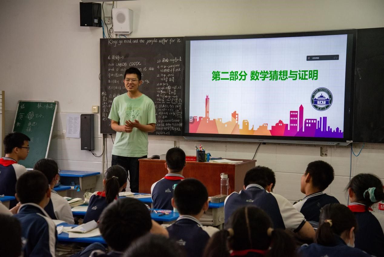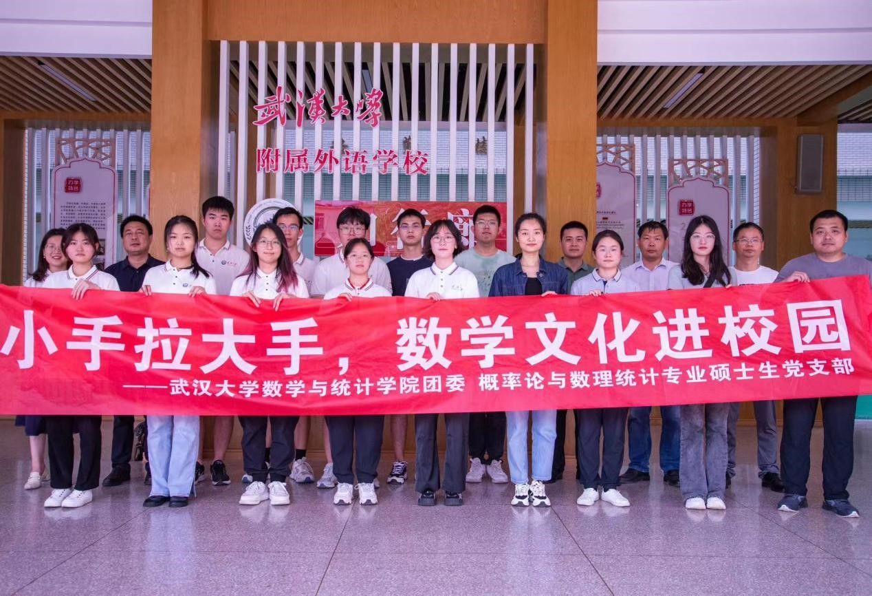 2023�5�19�下午�数学与统计学院首��青马��8名本科生和概率论与数理统�硕士�党支�4�研究生走�武汉大学附属外语学校开��小手拉大手,数学文化进校��主题党日暨“行走的团课”活�。数学与统计学院党委副书记黄安云、团委书记刘宇晖,附属外语学��校长周一敏�附属外语学校教务处、七八年级部分班级等参加此次活动�