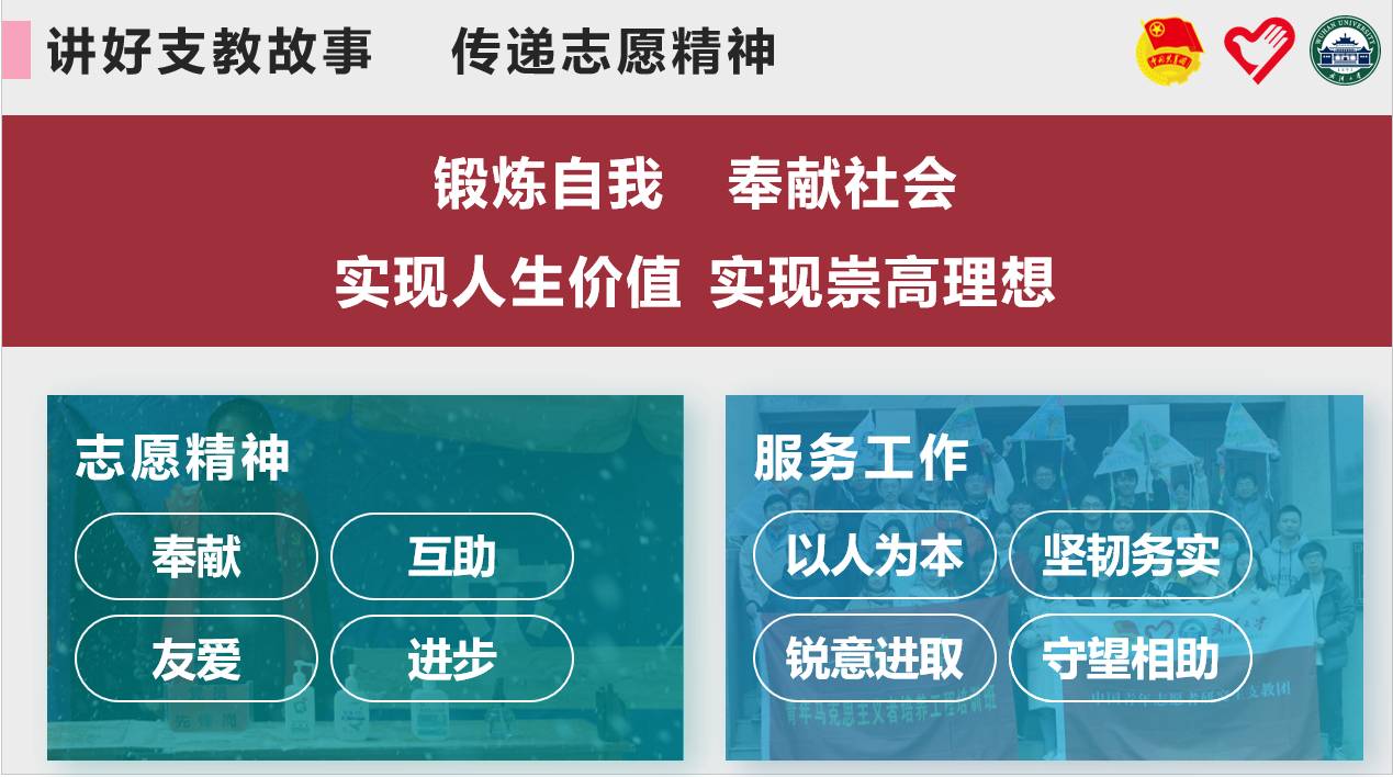 王子阳鼓励各位同学发挥“奉献互助友爱进步”的志愿精神,通过支教等服务工作机会锻炼自我,奉献社会,实现人生价值,实现崇高理想。