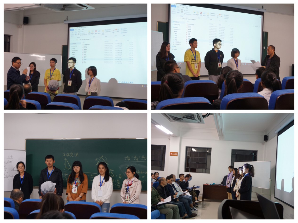 在主持人简要介绍了本次讲课比赛的评分规则后,比赛正式拉开了帷幕。15名参赛同学按照赛前的抽签顺序依次上台,五位同学一组,每组讲课结束后,由评委老师进行点评,讲课时可采用多媒体、板书等多种形式,限时10分钟。选手们讲课的内容广泛,涵盖了中学数学的许多重要知识点,如正弦定理、根与系数的关系、数列、随机变量、平面向量、一元二次方程等,此外,也有同学选择积分的相关内容进行展示。参赛选手或结合实例、或注重教学情景设计,运用启发式、探究式等教学方式,讲解知识要点,拓展知识深度与宽度。同时还注重台下的观众互动,调动起“模拟课堂”的课堂气氛。
