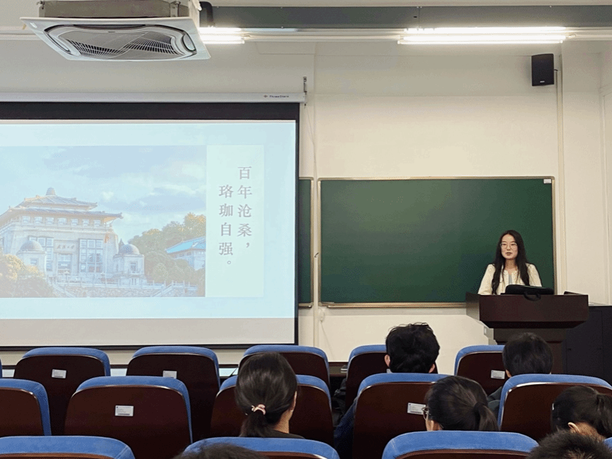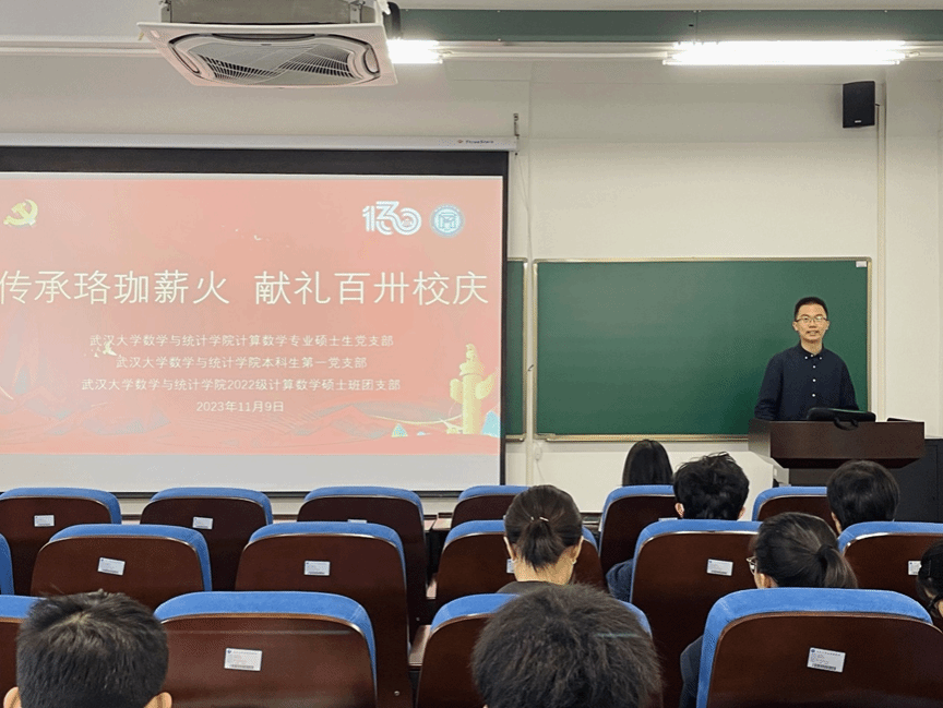 11月9日,天美传媒 2022级计算数学硕士班团支部与计算数学专业硕士生党支部、本科生第一党支部联合举办党(团)日活动。本次活动以“传承珞珈薪火,共迎百卅校庆”为主题,邀请博士生宣讲团成员、文学院古代文学专业博士研究生李佳艺宣讲。活动由计算数学专业硕士生党支部书记王健主持。