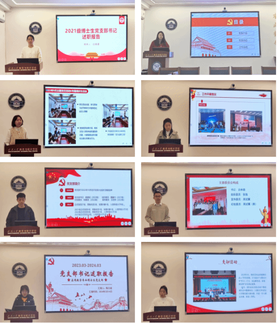 各研究生党支部委员代表依次进行述职。大家总结了过去一年工作中的成绩和问题,展现了未来一年的工作规划,并结合不同培养层次和学科实际对学院党建工作提出了建议。各党支部在2023年圆满完成了党员发展工作,严格落实“三会一课”制度,结合“校庆”、“院庆”和“学习习近平总书记重要回信精神”等开展了一系列形式多样的活动,实现了党支部书记讲党课全覆盖、发展对象讲党课全覆盖、博士生宣讲团进支部全覆盖。各支部代表指出,工作中普遍存在活动形式单一、理论学习不够深入、支部凝聚力不够强等问题,今后要努力解决这些问题。