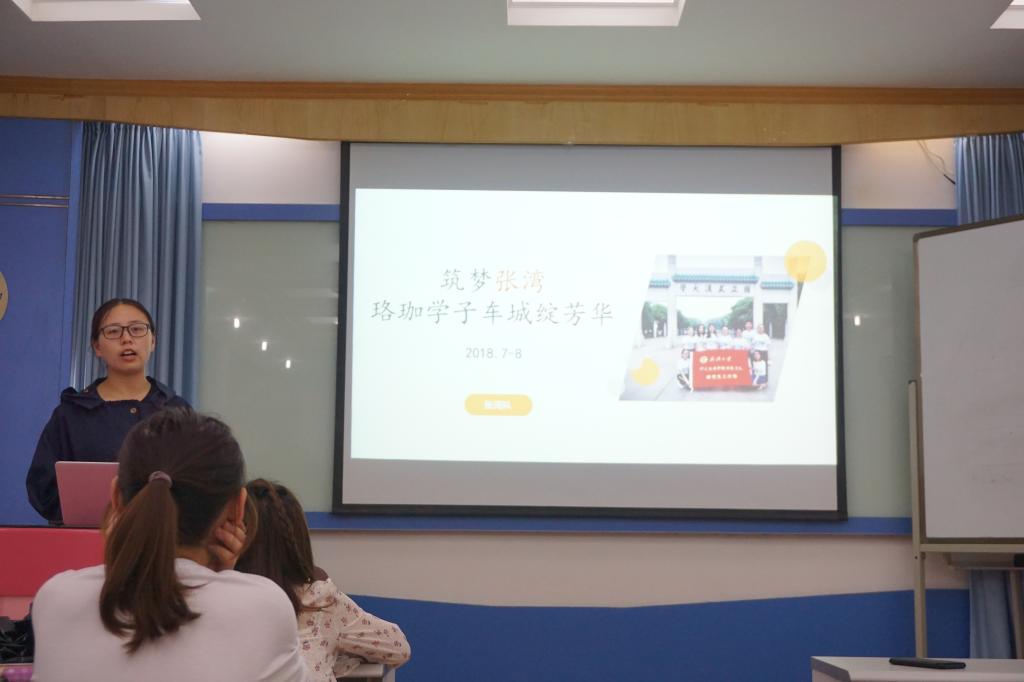 之后是由王硕同学分享她的挂职经历,她挂职地点是湖北十堰张湾区。在短短的55天时间里,她参加了青年大讲堂、考察了张湾创新创业产业、参与十堰创卫、调研张湾精准扶贫、列席十堰文创大赛等一系列精纷呈的活动。她通过图片、视频等多种形式对上述经历进行了生动的展示。