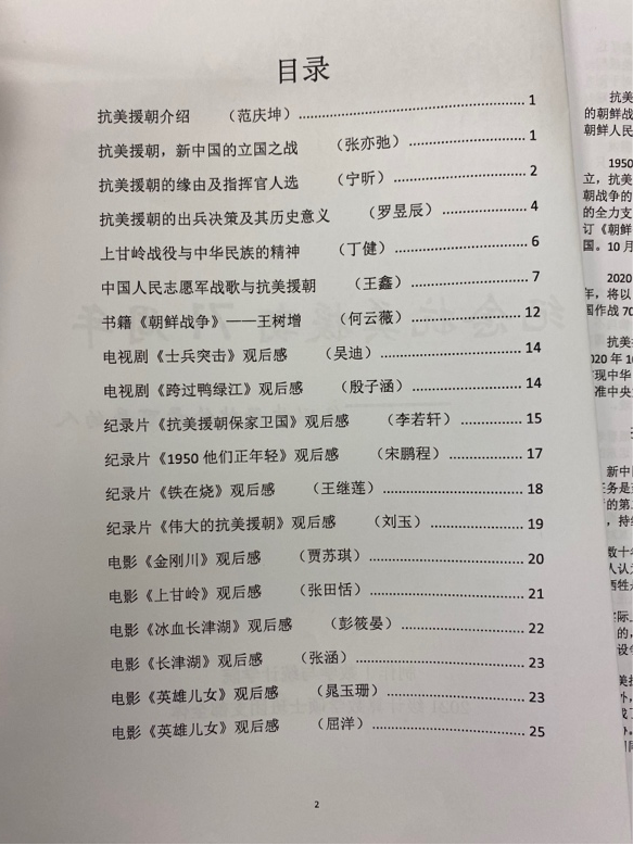 团日活动后,同学们热情高涨,纷纷通过自行观看影片的方式分享心得体会。从11�16日开始,每天会有两位同学在班级群中结合自己看过的抗美援朝相关的影视、书籍,通过文字形式分享印象深刻的事件、人物、台词以及感悟,从各个不同影视、不同角度谈论了自己对于抗美援朝战争的理解。最后,团支部将大家的分享汇总,并制作成纪念册,供同学们共同阅读学习�