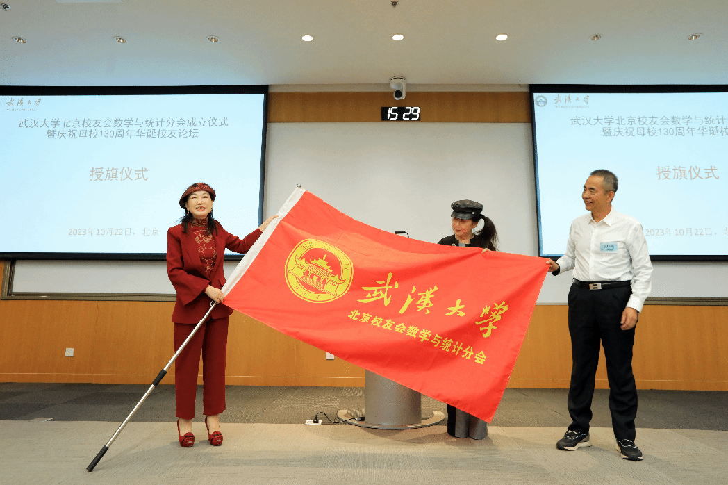 与会人员热烈鼓掌通过北京校友会数学与统计分会第一届理事会组成人员名单。银河证券原首席经济学家�1977级院友左小蕾担任会长,吴国凯、雷明、孙向红、龚六堂、汪小康、黄立虎担任副会长,吴国凯兼任秘书长。国务院参事室参事�1977级院友汤敏,中国人力资源开发研究会会长、国家发展和改革委员会社会发展司原司长�1979级院友欧晓理等多位资深校友担任特邀顾问。丁娟娟、许定波、徐刚、黄四民、张治国、许春晖�15人担任理事。喻杉代表北京校友会,为数学与统计分会郑重授予会旗�
