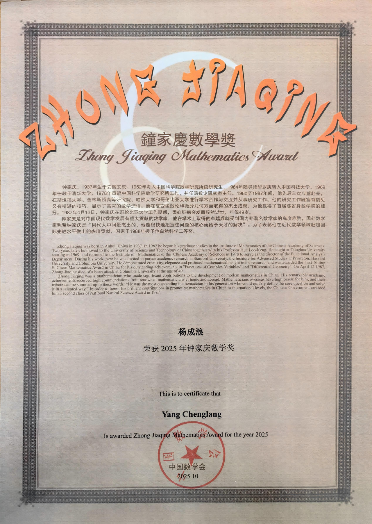 数学物理教研室授课教师、武汉数学与智能研究院助理教授杨成浪获第十九届钟家庆数学奖。